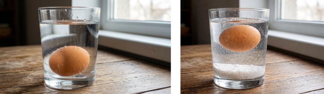 左为原图,右为生成的图片。提示词:如果往水中加入大量盐,生成一张图片,展示鸡蛋会发生什么。